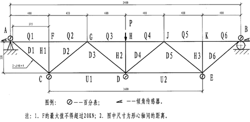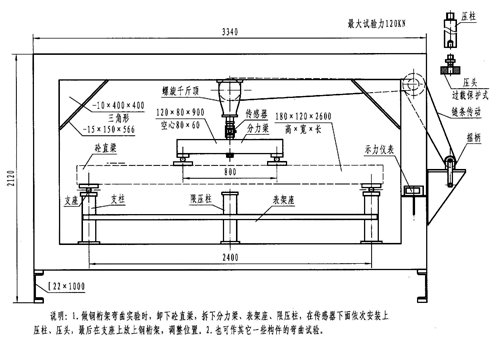 最大试验力120KN,支座跨度2400mm。重约950kg,外形尺寸长×宽×高=3670×1000×2120mm3。手摇螺旋千斤顶加载(通过链轮链条变速、传递),传感器测力,数显仪表示力,力值误差小于1%。实验装置的下横梁离开地面近280mm,方便手动液压叉车装卸砼直梁等物体。砼直梁的参考尺寸:高×宽×长=180×120×2600mm3,用户自备。钢桁架外形尺寸长×宽×高=2600×84×372mm3。